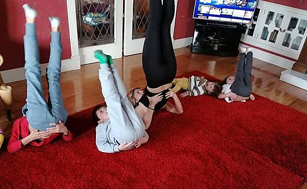 Para Gabriel (8 años), Mateo (10), Mariola (5 y medio) y Lucas (uno) estar juntos en casa de los abuelos es de lo más normal. Pero lo de no ir al cole y que todavía no sea verano, es raro… Salen al jardín pero nada más. Lo mejor es que a su tía Ángela Dirube siempre se le ocurren los juegos más divertido: una yincana en el salón con cojines por el suelo, hacer abdominales, jugar a relevos… Sólo hay una condición, que no compiten entre ellos. Sólo se miden a ellos mismos y cada uno tiene que esforzarse para mejorar sus marcas anteriores. Así no discuten, el tiempo pasa volando y terminan agotados... La mejor hora para ponerse en forma es sobre las siete de la tarde porque por la mañana los niños están enérgicos. Pero al hacer deporte antes de cenar, duermen del tirón.