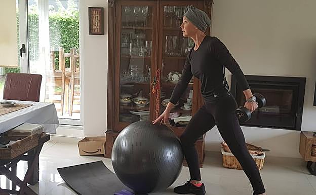 A la santanderina Yolanda Piney le ha pillado el encierro en pleno proceso de quimioterapia. Antes de que le detectaran la enfermedad, el ejercicio que hacía era salir a caminar, y aunque tenía ganas de empezar a entrenar con sus cuñados no encontraba el momento. Cuando llegó la fatal noticia, su familia le propuso ponerse en manos del entrenador Felipe Suárez, experto en enfermos oncológicos. Y lo hizo de la mano de su marido, José Ramón, una estrategia para enfrentar en pareja el estrés, la incertidumbre y el miedo que supone esta enfermedad. Juntos vieron que los ejercicios de fuerza mejoran tanto el pronóstico de la enfermedad como la tolerancia a la quimioterapia. La última sesión en Valdecilla fue la semana pasada, antes de que se decretara el estado de alarma, y supone que tiene que volver al hospital en unos días «pero todavía no me han avisado». Ahora hace los ejercicios en casa. No tiene una hora fija. «A veces por la mañana, otras por la tarde… Depende del ánimo que tenga. Lo que está claro es que el deporte me viene bien, entre otras, cosas porque pienso menos».