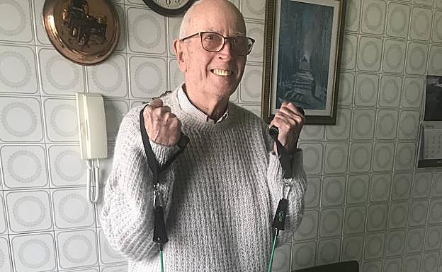 Manuel (Manolo) Hervás tiene 86 años y hace solo tres meses le operaron de la espalda. Sabe lo que es estar en silla de ruedas durante una larga temporada, pero su tenacidad y ganas de seguir siendo independiente le ha ayudado a volver a caminar. «Es muy cumplidor» y no ha dejado de hacer ni un solo día los ejercicios de rehabilitación. Tiene un aparato que cuenta los pasos y disfruta siempre compartiendo con alguno de sus tres hijos o de sus seis nietos los kilómetros que ha hecho. Ahora, aunque no puede salir a la calle, también sigue con la afición en el cuerpo de ejercitarse. Busca el sitio de su casa en el que se siente cómodo y empieza a hacer sentadillas y estiramientos con unas gomas que hace tiempo uno de sus tres hijos le enseñó a usar. Hasta hace unos días, un fisioterapeuta iba a su casa para ayudarle, pero la situación que atraviesa el país le ha obligado a hacerlo solo. Le gusta decir que «el ejercicio es muy poderoso siempre que se haga». Manolo es además un intelectual muy activo. Hasta el año pasado fue el director de teatro del IES Pereda, y siempre le ha gustado adaptar y escribir obras de teatro.