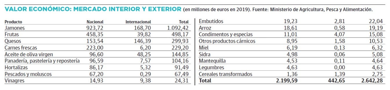 Los productos agroalimentarios españoles generaron en 2019 un volumen de negocio de más de 2.642 millones de euros, según el último estudio del Ministerio de Agricultura, Pesca y Alimentación. Según este mismo estudio, en 2018 el total de operadores primarios vinculados con dichas denominaciones de calidad en España era de 199.957, con un número total de 3.347 industrias que operan sobre 829.423 ha o manejan 2.294.164 cabezas productoras. La calidad en la cesta de la compra está asegurada.
