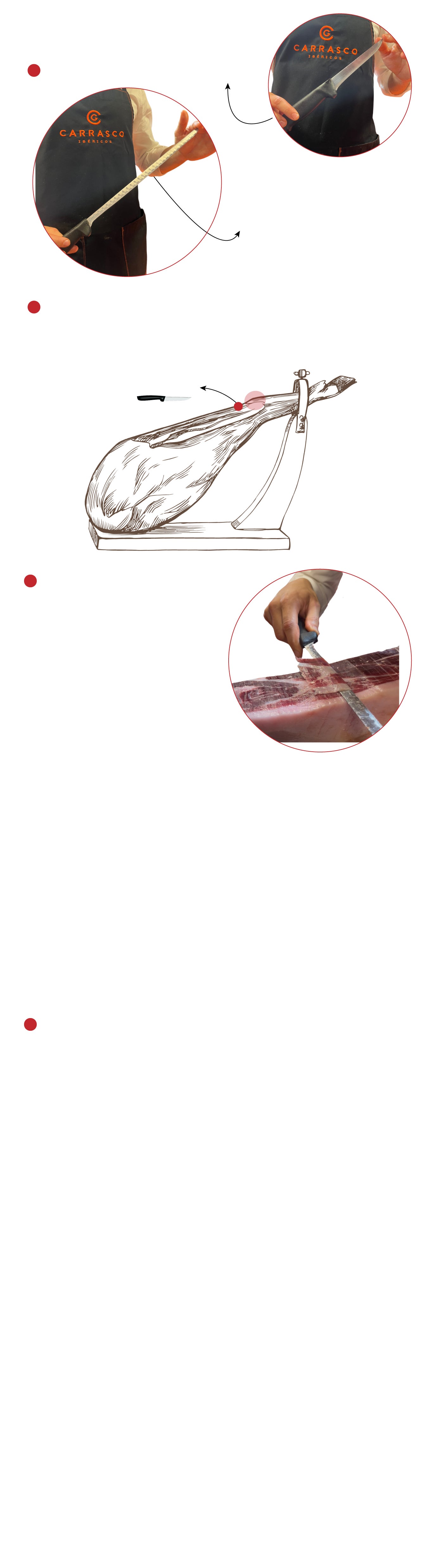 Lo primero que hay que hacer es limpiar el jamón. La pata se coloca con la pezuña mirando hacia arriba y se realiza un corte con la puntilla dos dedos bajo el corvejón. Desde ese punto, se comienzan a retirar el cuero y las impurezas, dejando la carne limpia.