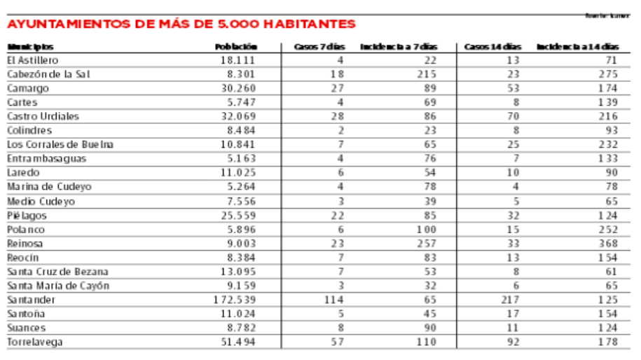 Dibujan un mapa dividido por colores que van del gris al rojo. Los indicadores para determinar el nivel de alerta sanitaria se han convertido en ... los protagonistas de la pandemia porque marcan el nivel de riesgo por territorio. Son esos umbrales que sirven al Gobierno de Cantabria para pisar el acelerador de las restricciones o aliviar las medidas. La comunidad autónoma, de momento, está en naranja. Sin embargo, por municipios, hay tres dentro del grupo con más de 5.000 habitantes que ya están en riesgo extremo por covid: Reinosa, Cabezón de la Sal y Polanco.