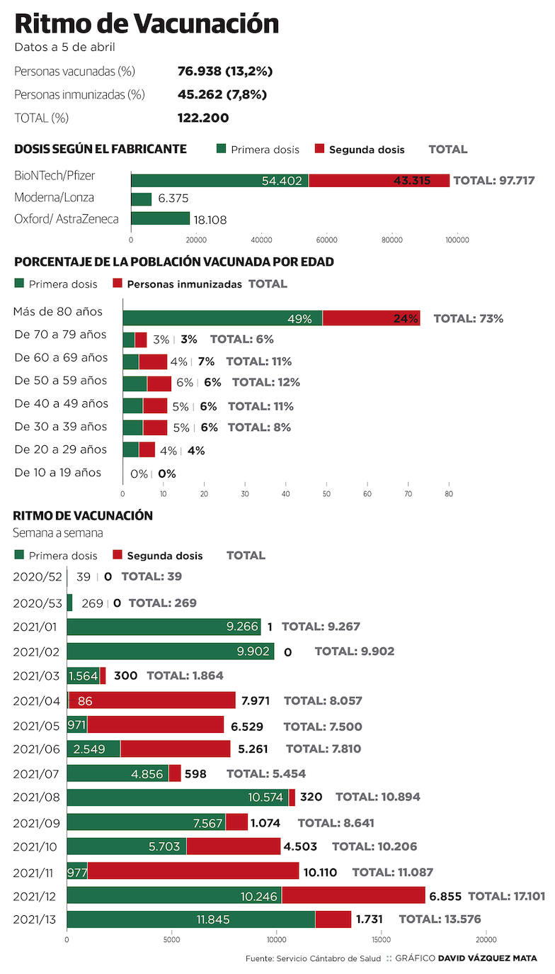 Según los datos de vacunación correspondientes al 4 de abril, el 13,2% de la población de Cantabria está vacunada contra el covid-19 de los que el 7,8% han completado la pauta.