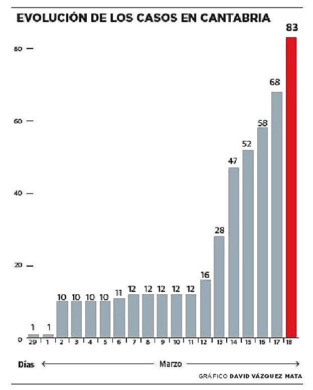 Según explicó este jueves el vicepresidente del Gobierno de Cantabria, Pablo Zuloaga, que compareció en una rueda de prensa virtual para informar sobre el nuevo paquete de medidas adoptadas por el Ejecutivo para paliar los efectos del Covid-19, el número de contagiados por el virus ha aumentado hasta los 83 casos, quince más de los contabilizados el miércoles.