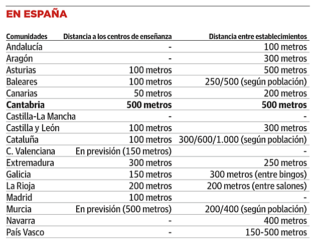 El Gobierno regional intensificó las inspecciones durante los últimos cuatro años: de 564 en 2016 a 1.188 en 2019Cantabria es la comunidad que más distancia exige entre las salas de juego y los centros escolares. Todos los locales que abran sus puertas ... bajo la última modificación legislativa -entró en vigor en enero- deben estar situados, por lo menos, a 500 metros. En el caso de las clínicas donde se tratan ludopatías (Unidades de Salud Mental), 250. Extremadura es la segunda más estricta. Allí deben mantener 300 metros con colegios e institutos y 250 entre establecimientos (la mitad que aquí). El Ejecutivo regional, además, ha intensificado el número de inspecciones que realiza con el objetivo de que la ley sea respetada de forma escrupulosa. En los últimos cuatro años, las visitas de los funcionarios pasaron de 564 (dato de 2016) a 1.188 (balance de 2019).