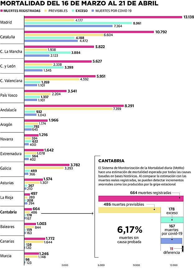 En el MoMo, elaborado por el Instituto de Salud Carlos III, Cantabria sale mejor parada. El incremento aquí de la mortalidad fue de un 36%, al haberse pasado de las 486 muertes habituales por estas fechas a las 664 de este año. La diferencia entre ambas cifras es el exceso (178), un número que cuadra casi a la perfección con los 167 fallecidos oficiales por Covid-19. Incluso encaja con mayor exactitud si se contempla la estimación que ya ha hecho el Instituto Cántabro de Servicios Sociales (Icass) acerca de que existan a día de hoy 13 casos sospechosos de muerte por coronavirus que no han sido comprobados.