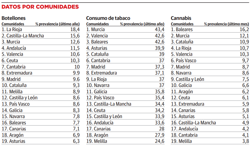 La región ocupa el sexto puesto nacional entre los más fumadores y el séptimo entre los más bebedores; pero en la adicción al cannabis se encuentra a la cola