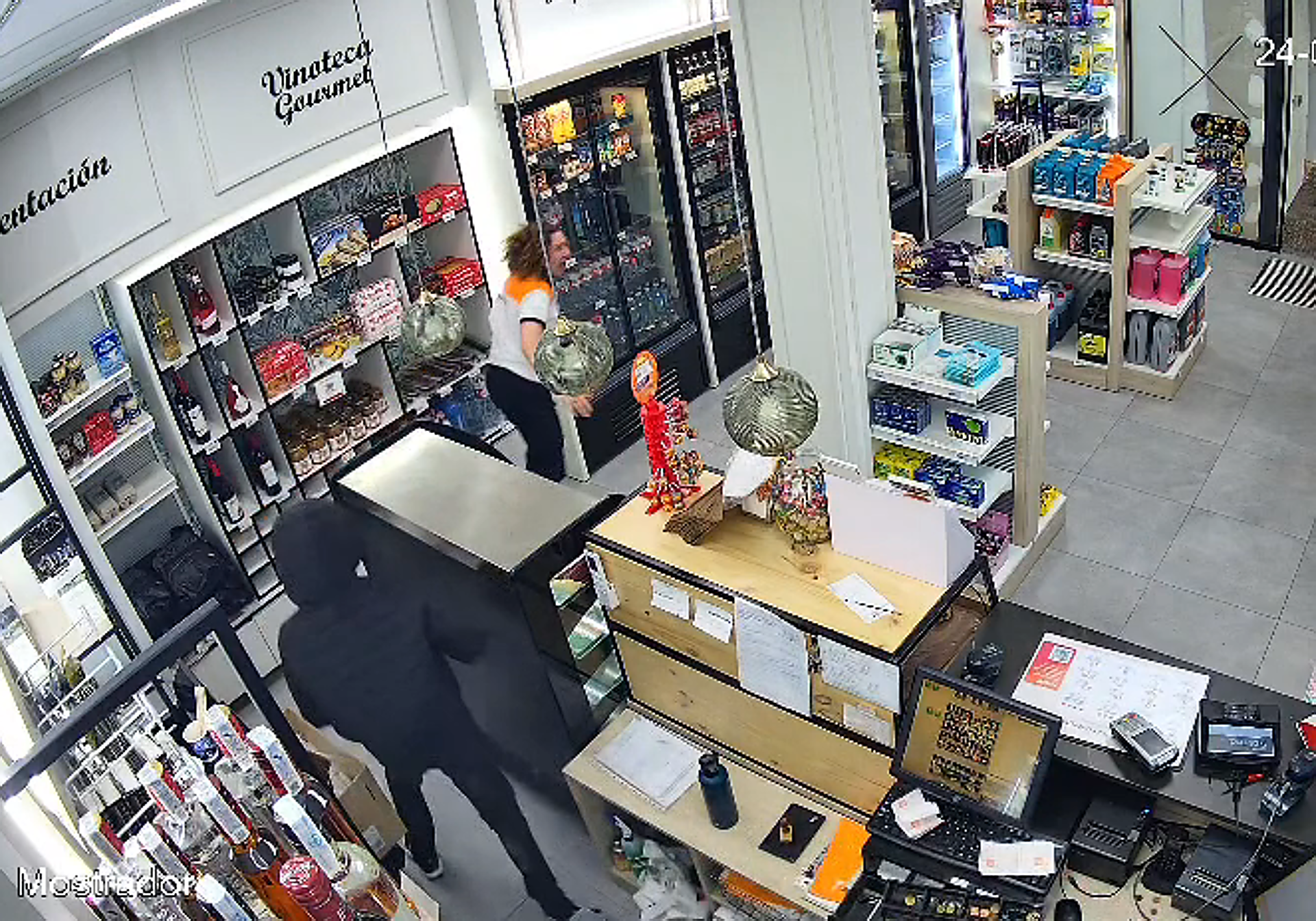 En las imágenes captadas por las cámaras de seguridad del establecimiento se ve a una persona encapuchada cogiendo el dinero de la caja registradora mientras otra vigila en la puerta