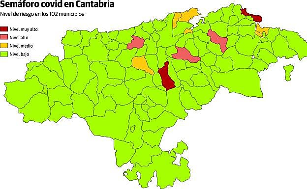 Tampoco Santander está para celebraciones, ya que el último semáforo sanitario reflejó que ha subido un escalón en el nivel de alerta de contagios y los santanderinos han pasado de correr un riesgo bajo a correr un riesgo medio. Esto conlleva mayor control de aforos en los establecimientos públicos. En Noja, Santoña y Corvera de Toranzo, la población encara un peligro mucho mayor de contraer el virus, ya que se han situado en riesgo «muy alto», lo que significa limitaciones para sus vecinos que, por ejemplo, no podrán consumir en el interior de los locales de hostelería durante toda una semana.