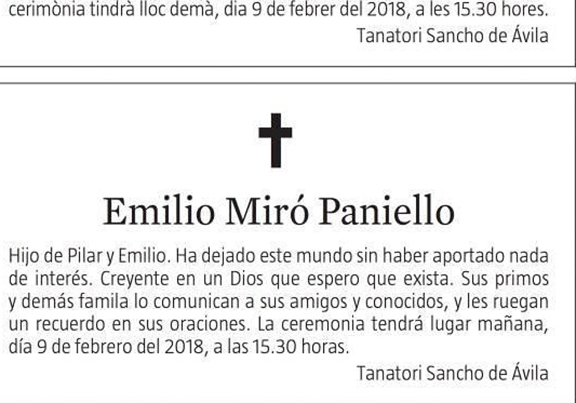 La familia del catalán Emilio Piró resumió su vida en la esquela: «Ha dejado este mundo sin aportar nada de interés». La gallega Laura Gippini murió con 47 años, y la familia pedía a sus amigos «menos dramones y más bombones». El único texto que contenía la esquela de un gaditano no pudo ser más escueto: «Yo, Javier Martínez Pastor, he muerto». No se quedaron atrás los amigos del madrileño Manuel Díaz Muñoz, que fue presidente de un club llamado 'Chumbalaka', compuesto por seis amigotes amantes de la buena vida: «Manolo, no nos esperes, ya iremos llegando. Tú, a tu aire». O la del también madrileño Miguel Ángel Morata, del que su familia elogia lo buena persona que fue, pero para el que tuvieron un reproche en su esquela: «¡¡¡Te vas sin dejarnos tu receta de paella de escabeche!!!». Y la de Justiniano Álvarez Montero, que en su esquela se lamentaban de que «se fue con la pena de no haber podido ejercer el derecho democrático al voto para José Luis Rodríguez Zapatero», o la del joven vasco Mikel Marroquín: «Os invito a mi última fiestuki en la iglesia de San Marcial. Abstenerse gente triste».