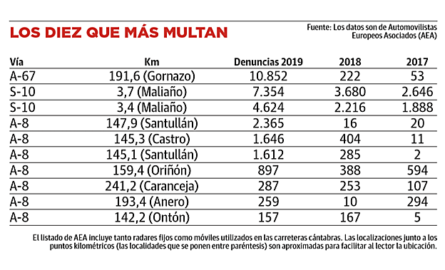Ninguno de los dispositivos cántabros está entre los cincuenta con más multas de España, según Automovilistas EuropeosSi a uno le hablan de la A-67 y del punto kilométrico 191,6 tal vez no se haga mucha idea. Pero si le ... dicen que es el radar de Gornazo, en dirección Santander, le vendrá a la mente -si conduce- que es el de los cien kilómetros por hora como tope y es posible que hasta le venga a la mente una imagen de ese lugar concreto. Y mucho más -por su propio interés- después de leer esta información. Porque ese radar fue el que más denuncias formuló en el año 2019 en Cantabriasegún los datos de Automovilistas Europeos Asociados. Desbanca de ese puesto 'de honor' al famoso de Saltacaballo, un clásico de las multas. Pero tiene truco. El de la A-8 no aparece ni entre los cincuenta primeros (contando localizaciones fijas y móviles) en la región. Más que nada porque no ha estado operativo. Eso sí, ninguno de estos controladores de la velocidad cántabros está entre el medio centenar más 'multón' de España. Se quedan, de hecho, bastante lejos de los integrantes de esa lista nacional.