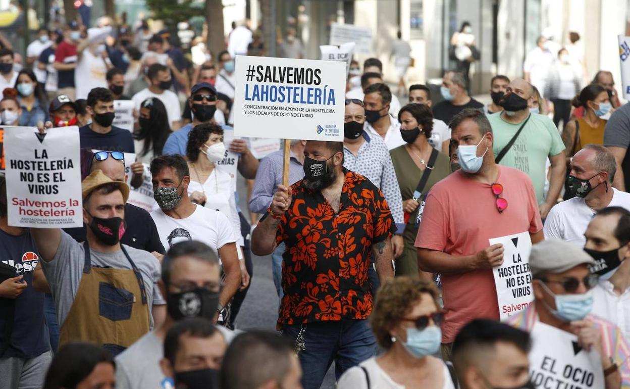 En la manifestación organizada por los hosteleros que esta mañana de miércoles recorrió las calles de Santander no hubo grandes consignas pero sí un mensaje claro: «No pueden culpabilizarnos de esta pandemia. No somos el problema y los causantes del grueso de los contagios, sino que de hecho podemos ser parte de la solución». Una idea que recordó el presidente de la Asociación de Hostelería de Cantabria, Ángel Cuevas, megáfono en mano, cuando la movilización con cerca de 500 personas alcanzó al final de la mañana la sede del Gobierno regional en Peña Herbosa.