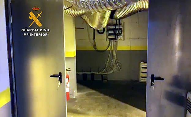 El garaje del chalet, de unos 300 metros cuadrados, se encontraba preparado con una compleja instalación divida en diferentes estancias, en las que se encontraban en cultivo plantas de marihuana en diferentes fases de crecimiento. Esta distribución de la plantación aseguraba el crecimiento de plantas y cosechas durante todo el año.