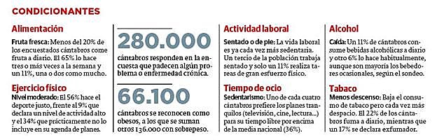 Un balance que casa con los resultados del epígrafe referido al sedentarismo en el tiempo de ocio, que no tienen reparos en reconocer cuatro de cada diez cántabros, más partidarios de ver la televisión, ir al cine o leer que de ir al gimnasio o salir a dar un paseo. Todo ello, cuando la vida laboral también está cada vez más ligada a una silla -el 29% de la población pasa la mayor parte de su jornada sentada- o a una actividad de desplazamientos cortos que no requieren grandes esfuerzos físicos (en este caso, representan casi un 62%).