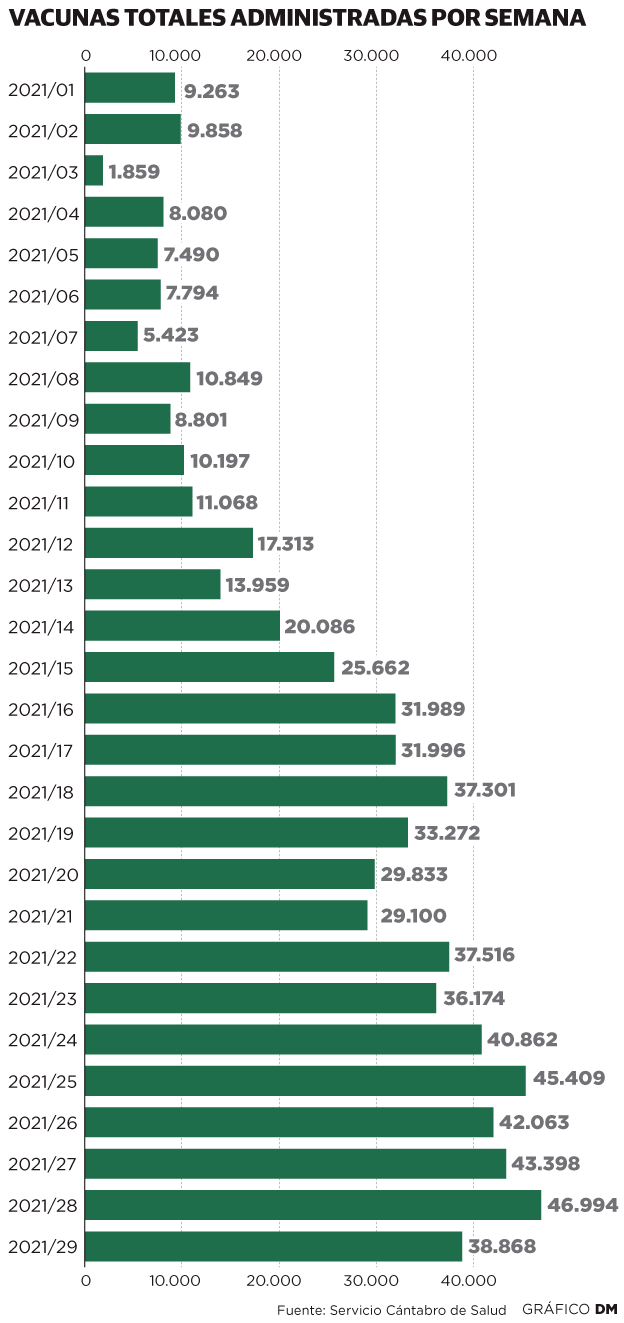Tan sólo una semana después de haber batido el récord de vacunación con 46.994 dosis, Cantabria vuelve a situarse por debajo del umbral ... de las 40.000 pinchazos semanales y ralentiza el ritmo que la situaba «por encima de la media del país». La razón de este descenso está en el número de dosis recibidas, ya que a pesar de que la región tiene ahora «más capacidad para vacunar», vuelve a recibir la misma cantidad de sueros que en el mes de mayo: ayer, sin ir más lejos, recibió 21.060 dosis de Pfizer y 3.800 de Moderna, es decir, 24.860 en total. ¿A qué se debe entonces haber batido récords este último mes? «Estamos administrando las segundas dosis de AstraZeneca que teníamos reservadas, y por eso salían esas cifras tanto esta pasada semana como la anterior, y además, en junio recibimos dosis extras, lo que provocó un aumento en las vacunas administradas», explica Celia Gómez, directora gerente del Servicio Cántabro de Salud.