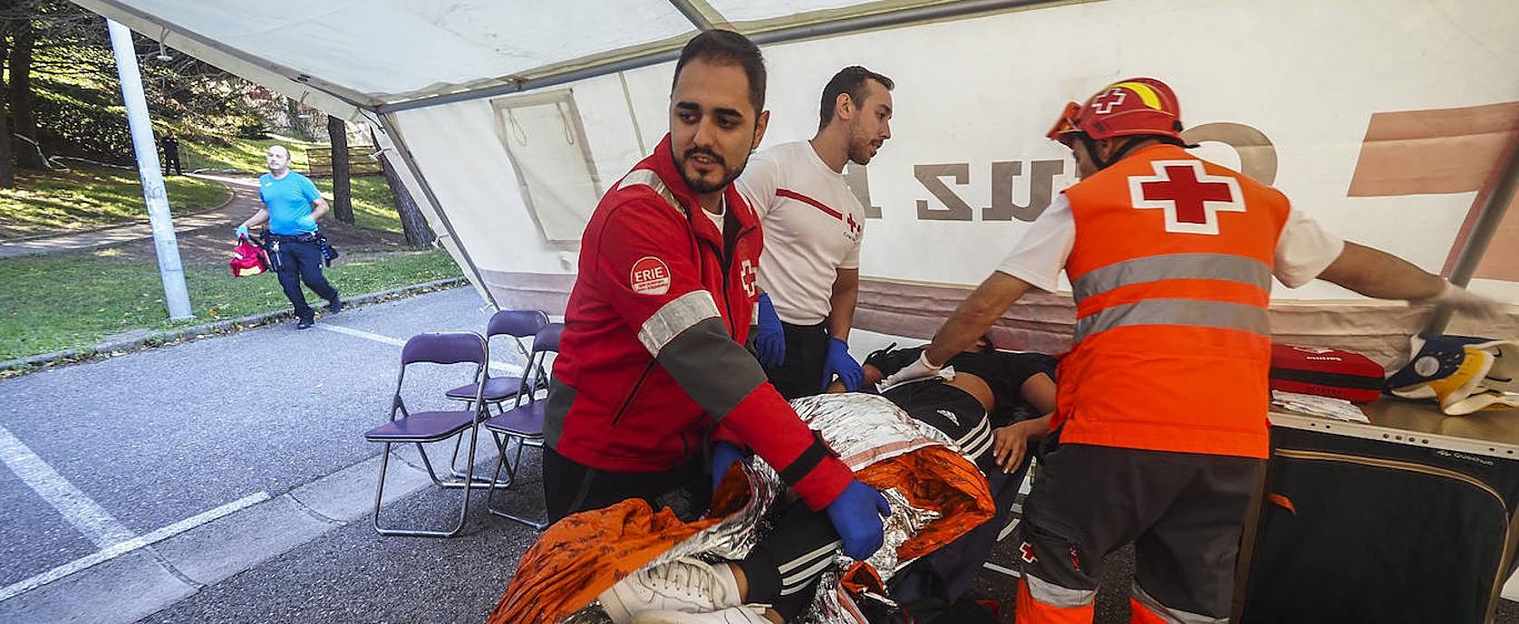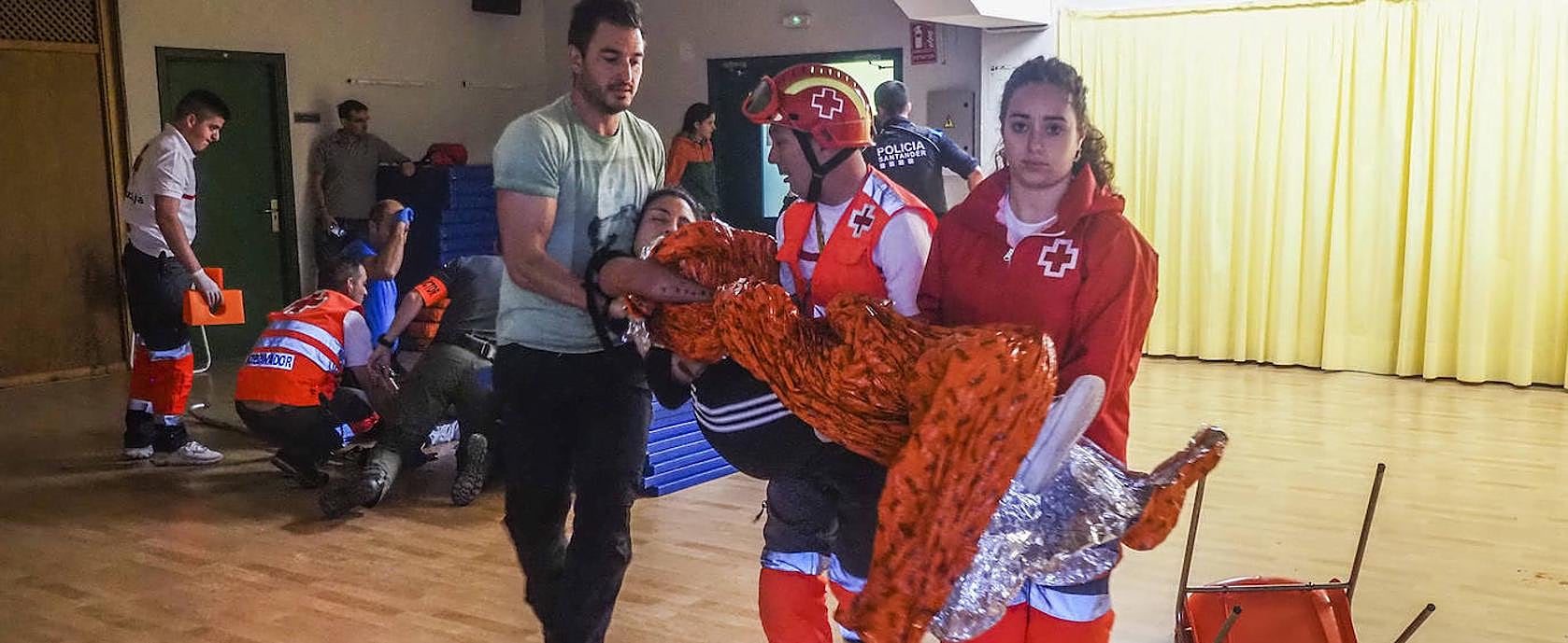 Más adelante, un segundo alumno que simula ser el otro terrorista, porta una pistola y dispara a los agentes. Los ecos de las balas de fogueo resuenan por los pasillos; pero una vez lo abaten, sólo se escuchan lamentos y el ruido de sirenas en el exterior del edificio. Han llegado los sanitarios. Comienza la evacuación y el ejercicio se da por cerrado. «Han sido 40 minutos frenéticos. Ha habido algún momento en que era realmente agobiante», cuenta una alumna a sus compañeras. Son estudiantes del Ciclo Medio de Emergencias Sanitarias del IES Cantabria, que se han prestado como voluntarios para la práctica.