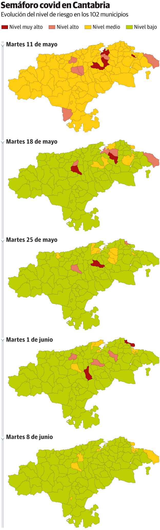 El descenso a nivel de riesgo medio de toda Cantabria permitió al martes siguiente, 18 de mayo, pintar de verde la mayor parte del mapa: noventa municipios en nivel bajo, seis en medio, cuatro en alto y dos en muy alto.