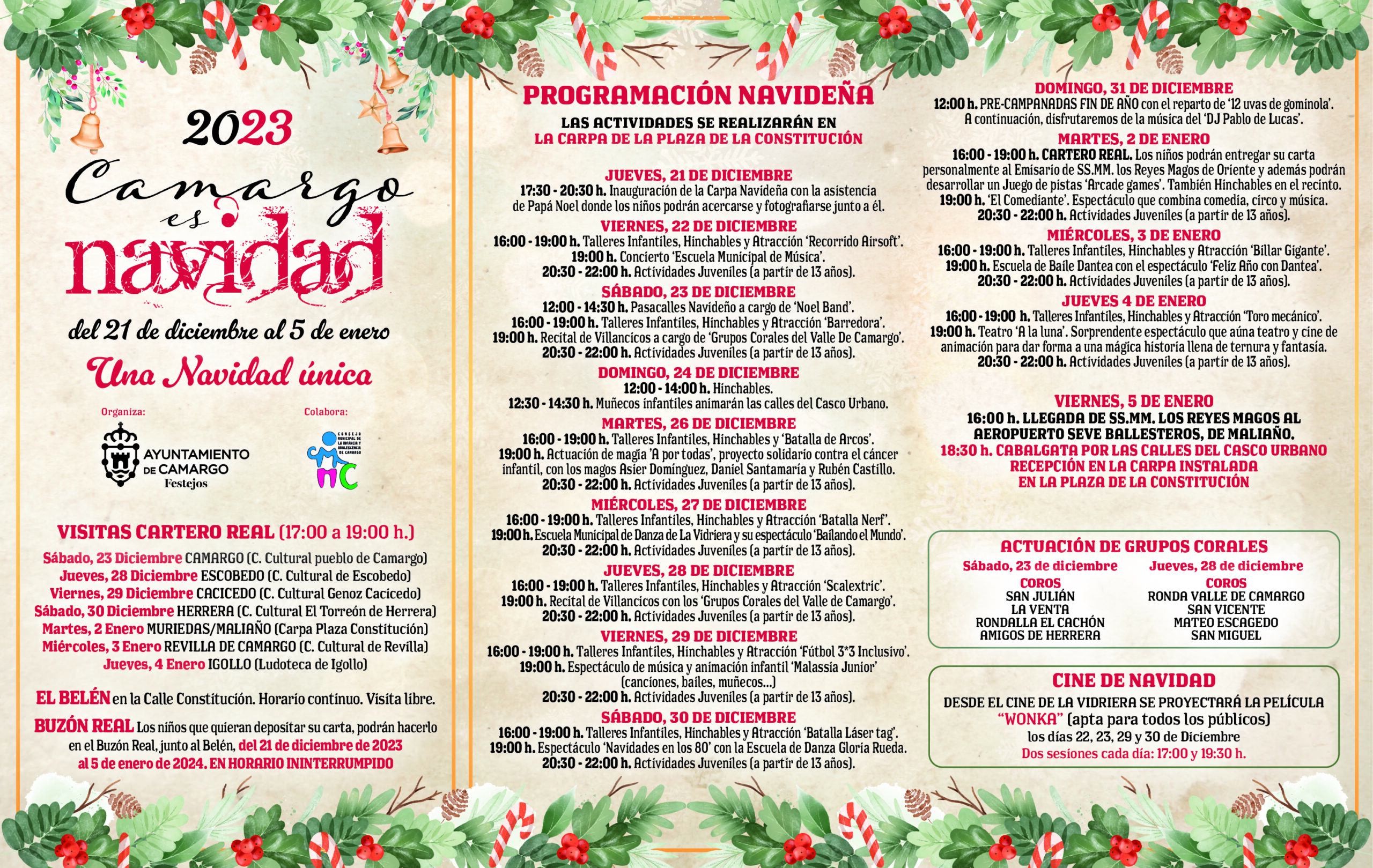 Batallas de hinchables, scalextric, música, danza, billar gigante, fútbol inclusivo, magia solidaria, cine, teatro, circo, juegos de pistas, Dj y actividades juveniles integran un programa de animación del que los chicos y chicas de Camargo van a poder disfrutar desde el día 21 de diciembre en la Carpa de Navidad de la Plaza de la Constitución.