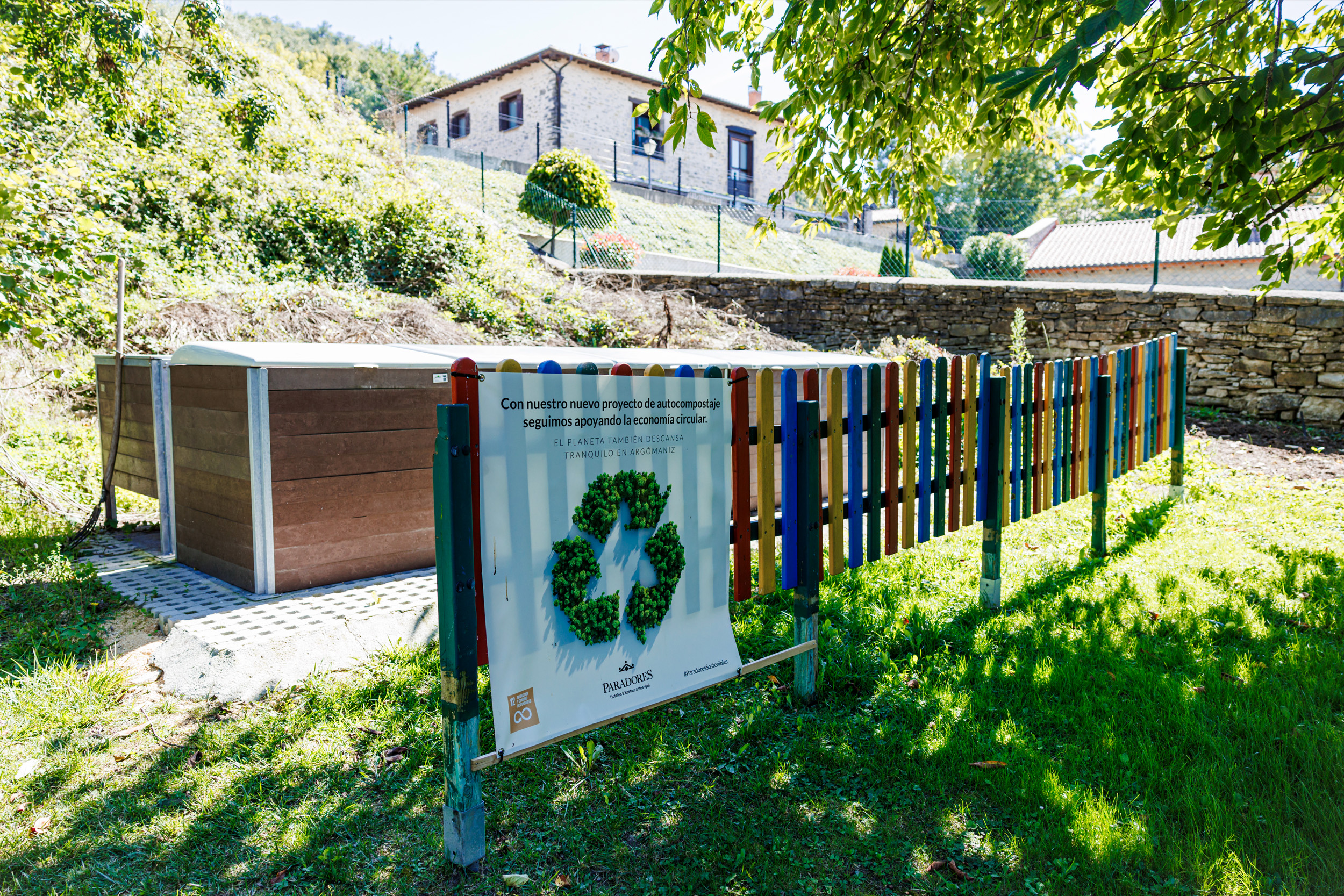 Más allá del jardín, en un pequeño escondite entre árboles, hay un recodo en forma de tanque de compostaje a donde no se llegaría si no vamos acompañados del director. Allí explica que “nos hemos convertido en un punto de compostaje líder, reciclando el 100% de nuestra materia orgánica sobrante”. El tanque incluye el reciclaje de restos de cocina y la creación de compost que se utiliza para el cuidado de las plantas del Parador y se regala a los clientes. “Este año vamos a compostar 5 toneladas”, destaca, subrayando el esfuerzo continuo para reducir la huella de carbono del establecimiento.