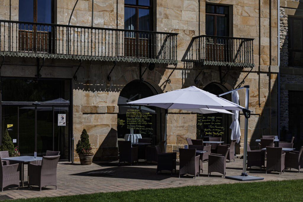 Originalmente propiedad del Virrey de México, el palacio pasó a la familia Larrea, quienes realizaron importantes aportaciones al edificio. “La familia Larrea dotó al edificio de rejería eclesiástica, mampostería y heráldica”, explica Manuel. Además, la última planta era el granero, donde hoy se ubica el salón-restaurante. Al subir las escaleras que conducen al gran salón, uno puede contemplar la cubierta donde queda a la vista la viguería, que se soporta gracias a las filas paralelas de pilares de madera. Resulta llamativo, por su carácter imponente, el entramado que no posee ningún anclaje metálico. Allí, esa presencia de la madera convierte al restaurante en un lugar donde la comida se disfruta de otra manera, sobre todo porque las ventanas de ojo de buey dan a la Llanada y los comensales pueden contemplarla mientras disfrutan de la comida.