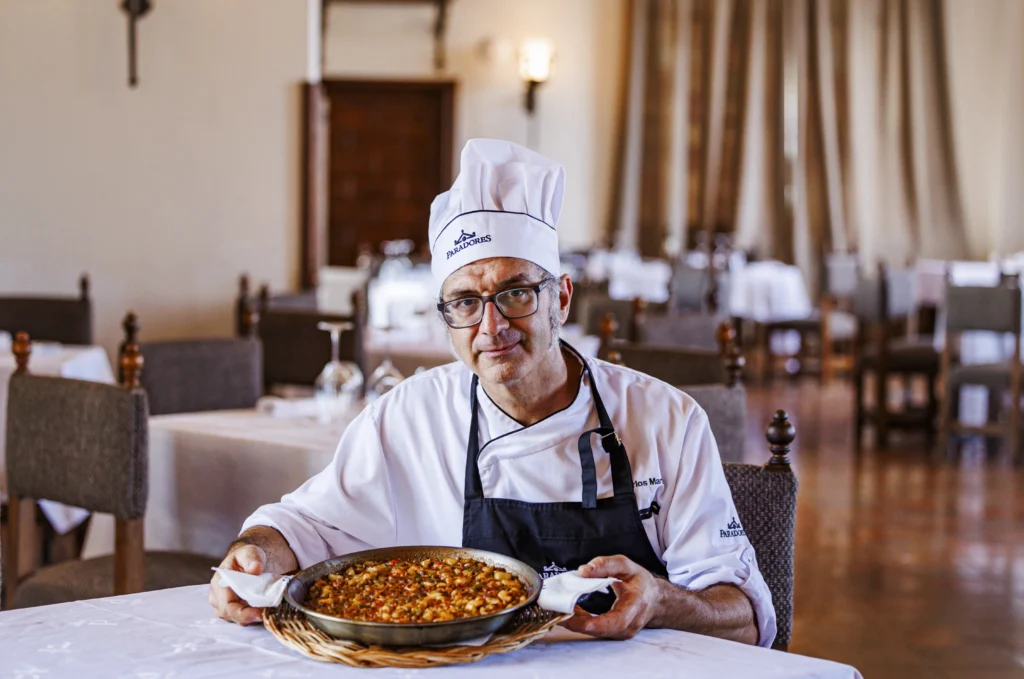 El Parador de Tortosa cuenta con un chef con personalidad. Carlos Martín es un gaditano que —sorprendentemente— vive la cocina “como una válvula de escape”. Las comandas, la tensión y las temperaturas de un servicio no le ponen nervioso. Cuando era más joven estudiaba guitarra en el conservatorio, pero cambió la melodía y los acordes por el gorro de cocina. No obstante, es un hombre creativo al que le gusta “innovar cuanto sea posible” para sorprender a los comensales. “Cuando estoy en casa le doy muchas vueltas a la cabeza para ver cómo puedo darle la vuelta a algún plato”, explica. El punto de inflexión de su carrera fue la formación del Basque Culinary Center, donde aprendió que no hay combinaciones imposibles, sino que hay que investigar cómo conseguir la receta adecuada. Carlos afirma: “Hay que mezclar conocimiento y experiencia. Yo no puedo dejar de lado mi formación como jefe de cocina”. Quizá por eso presenta sus platos con una sofisticación que lo diferencia de los demás. Le gusta ser atrevido sin renunciar a la tradición. En el menú destacan la escalibada de hortalizas con anchoas, un entrante sencillo y sabroso que manifiesta la calidad de la materia prima de la zona. Pero sus atractivos principales son, cómo no, los arroces: caldoso de calabaza y setas o el caldoso de galeras. Sorprende el equilibrio que ha conseguido Martín en el arroz costa del Ebro “tot pelat”. Para culminar la experiencia, los finales dulces son los mejores. En este caso, con una crema catalana, crema de naranja y chocolate o la mousse de “mel i mató”.
