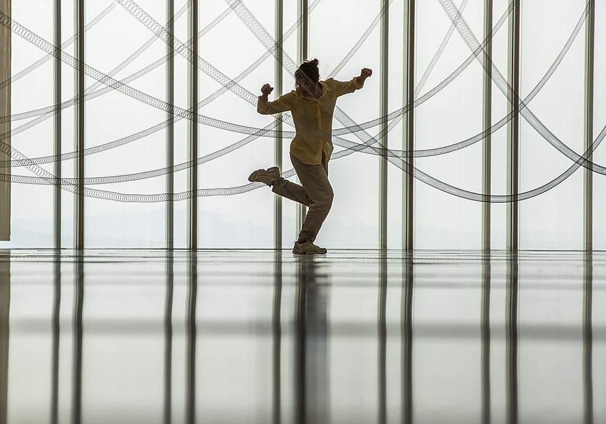 La pieza ocupa la segunda planta del edificio y convierte el espacio en una especie de organismo vivo. En ella, una bailarina –en realidad siete intérpretes que se van turnando en cada pase– se enreda en una estructura de muelles metálicos que evocan la energía y el vaivén del mar. Los rodea, los tensa, los agita o los acaricia mientras suena una composición creada ex profeso por el músico y artista Duval Timothy, quien ha traducido en once piezas los ritmos y las formas de once olas reales desaparecidas en las que se inspira el proyecto. Cada pase, de media hora, es distinto: cambia con la luz, la hora, el estado del mar o la meteorología y es que, a través de los grandes ventanales de la sala, el Cantábrico se integra en la instalación y el público puede sentarse, caminar o dejarse envolver por el movimiento y el sonido.