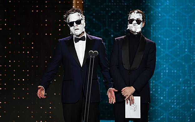Dice Ernesto Sevilla que cuando la noche y la fiesta decaen, el se pone espuma de afeitar por toda la cara y unas gafas de sol y la cosa se anima. Pues esta noche han sido Sevilla y Joaquín Reyes quienes se han presentado de esta guisa para presentar el Goya al mejor maquillaje. «No hay año que no nos pidan volver a presentar la gala», ha dicho Reyes en referencia a la funesta conducción que hicieron ellos hace tres años. «Vamos así para homenajear al maquillaje», ha dicho Sevilla. «No es que tengamos prohibida la entrada», ha apostillado Reyes.