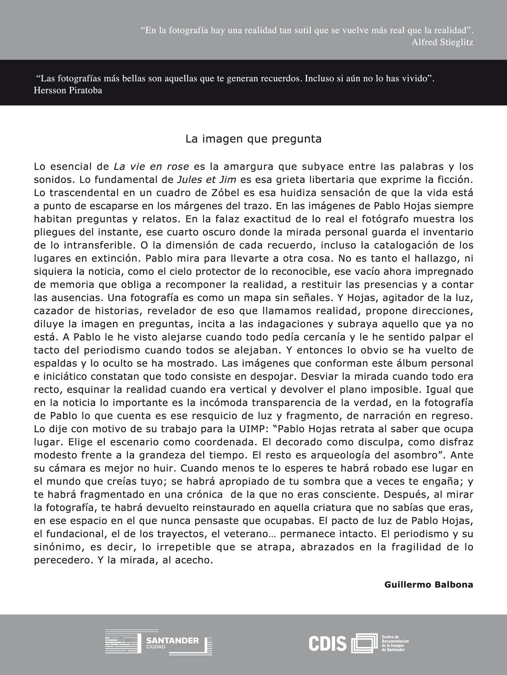 «Nos es imposible explicar con palabras el pesar que nos produce su pérdida, porque la figura de Pablo se erigió como un referente intangible no solo en la fotografía y en el fotoperiodismo, su gran pasión, sino de otros muchos ámbitos», ha señalado la Asociación de Fotoperiodistas, que ha destacado que Hojas tenía «una personalidad tan especial que trascendía con mucho el mero ámbito profesional». El fallecido tenía el carné número 1 de esta asociación y era su presidente de honor. Así que el colectivo siente hoy que «Pablo siempre estará entre nosotros, allá donde una cámara de fotos busque un encuadre, capte un momento único, lleno de luz».