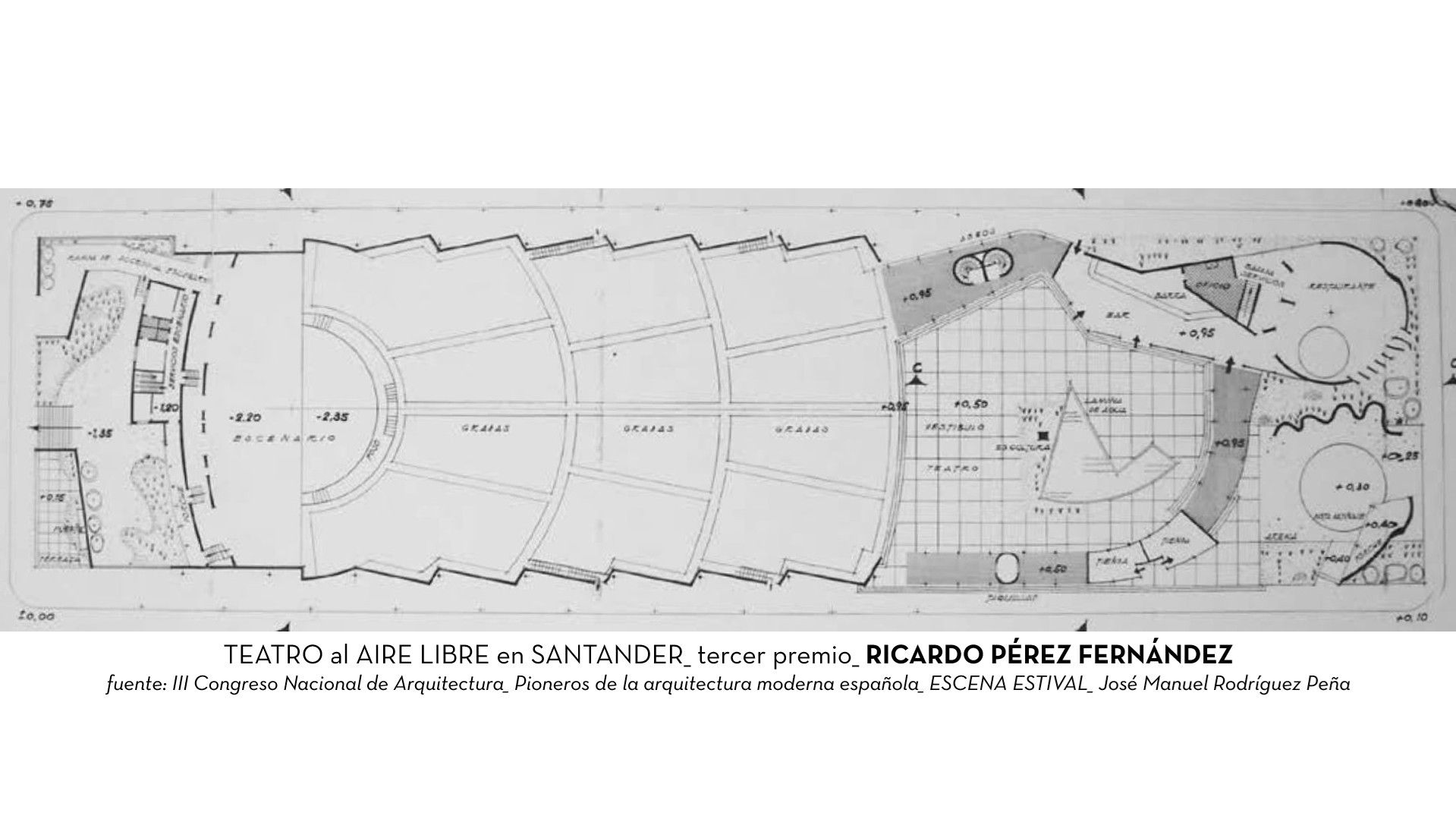 Por su parte, la propuesta de Vázquez Molezún, además de esa valoración que se le hizo como la «mejor solución urbanística», probablemente fuera la que tuvo la formalización más geométrica, clara y ordenada, como puede apreciarse en una planta perfectamente ortodoxa que, tras diferentes croquis, llegó a la limpia conclusión de ubicar el escenario en el centro del espacio, con sendos graderíos, aseos y accesos, situados al este y al oeste, desarrollando así plenamente el eje longitudinal del espacio donde se asentaba.