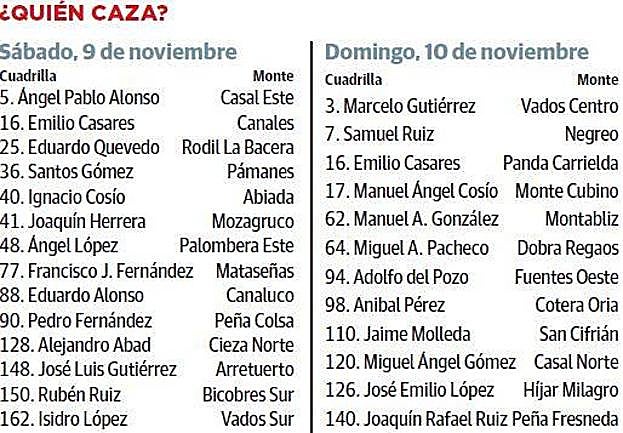 Varias cuadrillas rondaron el pleno o tuvieron cifras muy aceptables. En el monte cabuérnigo de Valfría los cazadores de la 43 -Fernando González- abatieron a cuatro marranos de los cinco permitidos. También a uno del cupo, un '2 de 3' estuvieron los componentes de la cuadrilla 21 que lidera Javier Fernández en Fresneda Gesía, en la comarca de Valdeiguña. En Rionansa, del lote de La Cestera los cazadores de la 163 que comanda Manuel Udías se bajaron con cuatro animales de los seis que está permitido cazar allí. Soto y Proaño, en Campoo, dieron tres de los cinco jabalíes permitidos a los cazadores de las cuadrillas 49 -Carlos Antuñano- y 89 -Jesús Ángel Arenas-, respectivamente.