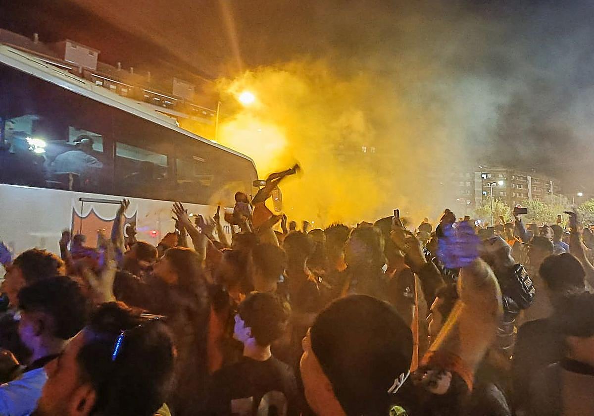 El partido copero ha desatado la ilusión en la localidad castreña, donde se vive un ambiente único e impresionante a la llegada de los jugadores. Como en las grandes citas, los pupilos de Jon Andar Lambea han sido recibidos por su afición. Los aledaños del Riomar se han convertido en un infierno gracias al humo rojo de la multitud de bengalas prendidas, los golpes al autobús y las banderas y bufandas al vuelo. Todo para llevar a jugadores y cuerpo técnico en volandas. Lo de hoy es un día histórico y la afición así lo ha demostrado.