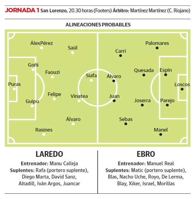El de Beranga medita reforzar el centro del campo para llevar la batalla a esa zona. En lo que se refiere a la alineación, el preparador se ha preocupado y mucho de esconder sus cartas durante los dos últimos días, así que solo queda recurrir a la especulación. En cuanto a nombres, la portería volvería a estar ocupada por Puras. En la retaguardia, la lógica invita a pensar que Guipu, regrese al centro de la zaga acompañando a Goñi, con Rasines y Álex Pérez como laterales. La pareja de mediocentros será la formada por Felipe y Faouzi, en las bandas pueden continuar Álvaro por la derecha y Saúl García por la izquierda, con Vinatea como enganche y Siafa como principal referencia ofensiva.
