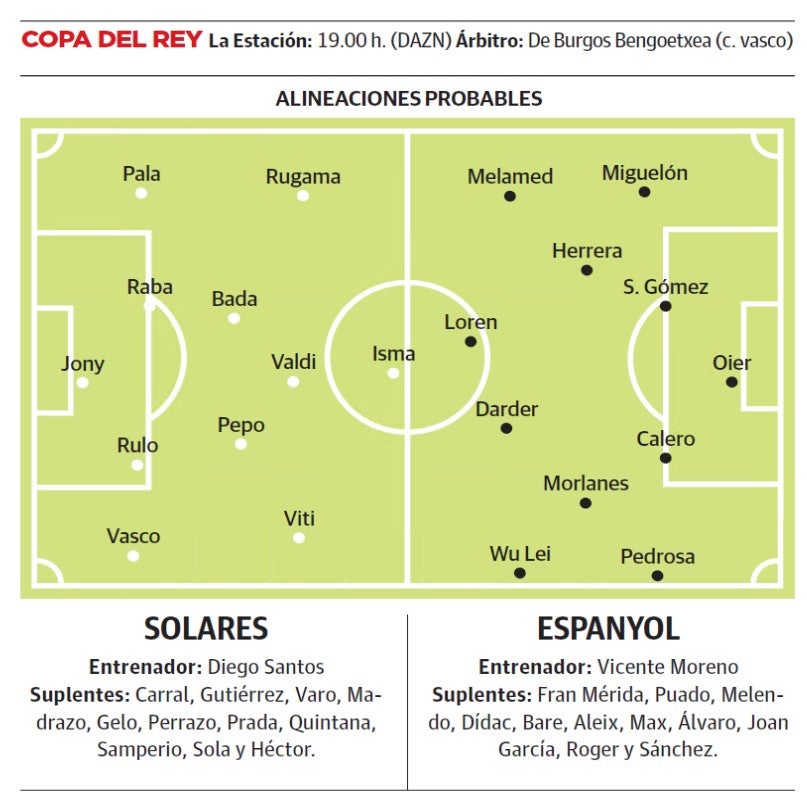 Diego Santos no tiene la osadía de hablar de «puntos débiles» del Espanyol, afirma entre risas. Pero sí en esas sesiones de vídeo han analizado «dónde nacen sus ocasiones. Hemos ido a lo que más redunda en su juego». La abismal diferencia entre uno y otro equipo hace que para tener una mínima oportunidad de eliminar al Espanyol, el Solares no se encomiende a otra cosa que «ser muy intensos y correr mucho», apunta su entrenador. Pero todo ello, con cabeza. «Ni ser unos kamikazes dejando la defensa desguarnecida, ni tampoco colgarnos los once del larguero». Para esa intensidad, el Solares contará con dos aliados. Por un lado, «el campo», lógicamente más pequeño que el RCDE Stadium donde juegan los pericos. Y por otro, la meteorología. Muy a pesar de todo el mundo, las previsiones apuntan a que vuelve la lluvia.