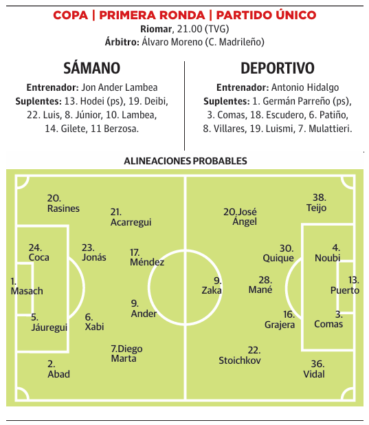 Las noches de Copa son mágicas.Entre otras cosas, porque pueden e incluso suelen salirse de la normalidad. Por eso, cuando hoy a partir de ... las 21.00 horas ruede la pelota en el verde de Riomar, el Sámano, que debuta en la competición, tendrá licencia para soñar con dar una sorpresa mayúscula ante el Deportivo, un equipo que marcha octavo clasificado en Segunda División, pero a tan solo dos puntos de los puestos de ascenso directo. Todo un campeón de Liga del que le separan ahora dos categorías.