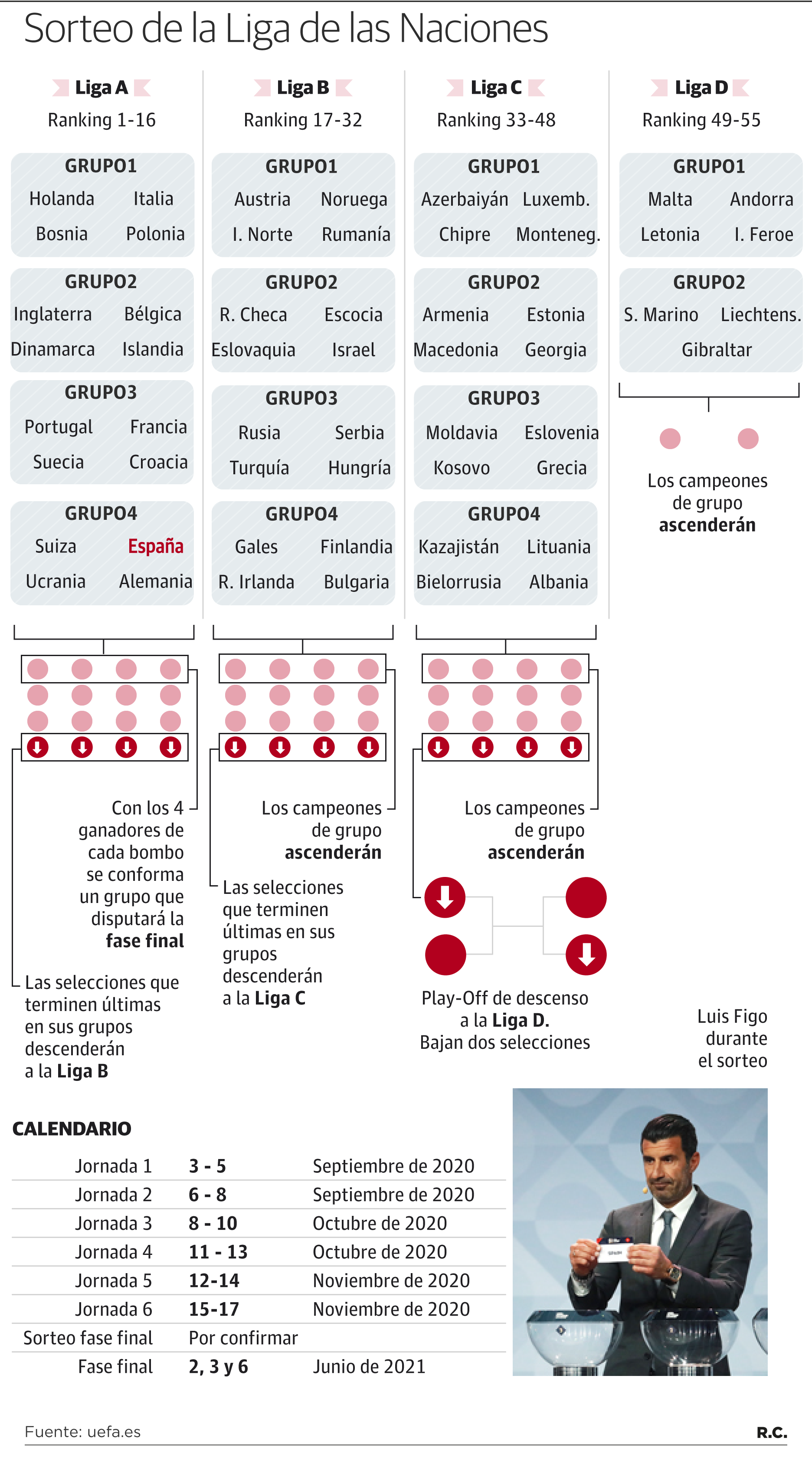 La multicultural Suiza del serbio Vladimir Petkovic, la joven y talentosa Ucrania que dirige Andrei Shevchenko y la poderosa Alemania del hace tiempo cuestionado Joaquim Löw, en la que el portero Ter Stegen es suplente habitual, serán las rivales de España en la máxima categoría de la segunda edición de la Liga de Naciones, cuyo sorteo se celebró este martes en el Centro de Conferencias de Ámsterdam con la mano inocente del portugués Luis Figo, embajador de la UEFA y exjugador del Barcelona y el Real Madrid.