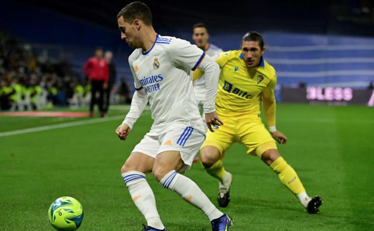 Las ocurrencias de Vinicius en el regate levantaban a un público del Bernabéu algo adormecido por el ejercicio de resistencia numantina del Cádiz, al que el plan de Cervera le acabó valiendo para llevar las tablas hasta el descanso, que no trajo consigo cambio significativo alguno. La segunda parte comenzó con el Madrid picando piedra, sin encontrar la tecla más allá de una buena combinación entre Benzema y Hazard desbaratada por la zaga amarilla. Al belga no se le pudo negar la voluntad, pues rozó el gol tras uno de esos centros de Kroos de precisión germana, marca de la casa. La peinó el '7' blanco pero Ledesma le negó el premio.
