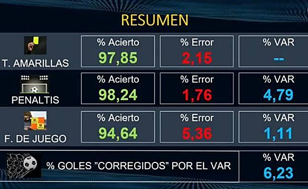 Según los datos del CTA, el VAR ha intervenido en las primeras 19 jornadas ligueras en un total de 59 acciones de juego, con 30 revisiones de goles, 20 sobre penaltis, seis en el caso de tarjetas rojas y tres por confusiones de indentidad.