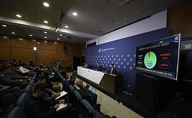 Carlos Velasco Carballo, presidente del Comité Técnico de Árbitros (CTA), y Carlos Clos Gómez, director del proyecto VAR, han hecho balance del sistema de videoarbitraje una vez concluida la primera vuelta y en un ambiente muy diferente al de su última comparecencia, hace casi dos meses, debido a las críticas de las últimas semanas.