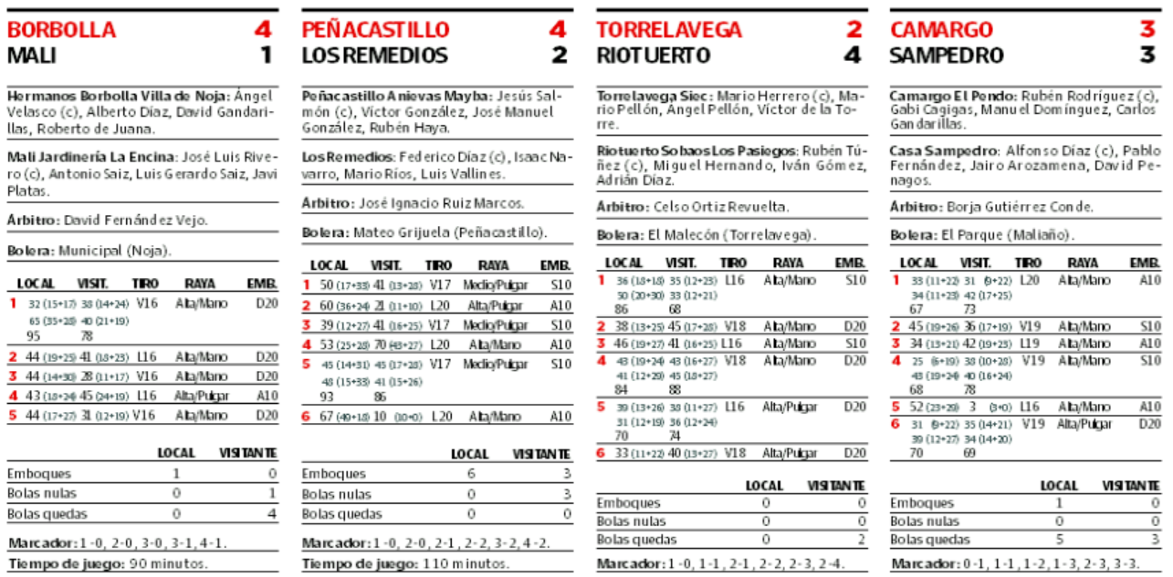 En Noja, Borbolla volvió a realizar un partido muy sólido para quedarse con el liderato en solitario. Otra vez un emboque decisivo, en este caso de David Gandarillas, tras una primera tirada titubeante, les permitió coger ritmo para cerrar en el resto de parciales y superar a Mali, que pese a no jugar mal volvió a caer y se mantiene colista todavía sin puntuar. Después de haber jugado contra dos peñas de la zona baja, los nojeños han salido airosos también de retos como el de Riotuerto o Andros La Serna y han dado muestras de que pueden pelear hasta el tramo final de la competición por hacerse con el trofeo.