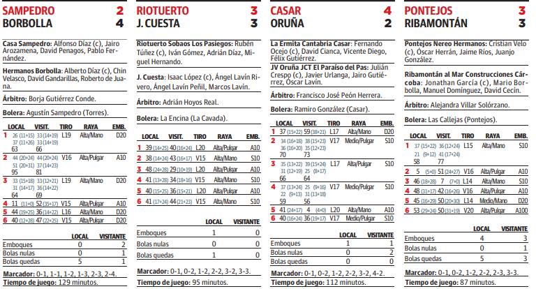 En realidad no mereció perder Casa Sampedro, que en el segundo chico hizo un esfuerzo por igualar la contienda después de empatar a 44 palos, y que en el cuarto se encontró con que David Gandarillas y Alberto Díaz acertaron con un emboque al pulgar en el que el cachi estaba a medio metro del tablón. Eso también es Borbolla, acierto en los momentos clave. Tras recortar distancias en el quinto, a la mano, Alfonso Díaz insistió al pulgar, un intento de contrarrestar las virtudes de los nojeños y que chocó contra el gran momento del cuadro costero, que se fue hasta los 47 palos para sentenciar un encuentro que le deja como líder una semana más a la espera de una jornada doble en la que sus dos principales perseguidores se quitarán puntos entre sí.