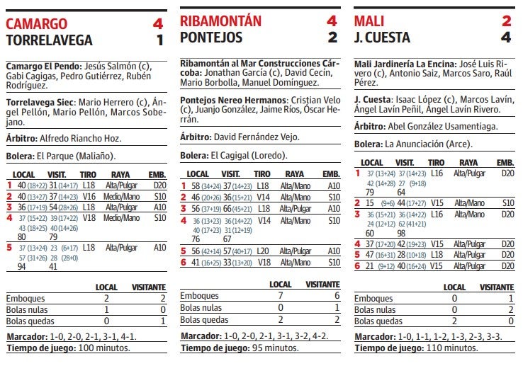 La jornada se completó con otros dos encuentros. Uno de ellos supuso el pleno liguero de Ribamontán, que después de remontar la pasada semana en Torrelavega ofreció una muestra de solidez ante una peña de Pontejos que vendió cara su derrota. Los de Loredo duermen como líderes con dos victorias en otros tantos partidos y se postulan como una de las peñas revelación del curso. En la parte alta de la tabla se coloca también J. Cuesta, que superó en un trabajado partido a Mali en el corro de La Anunciación. Los de Cerrazo mejoraron sus prestaciones de birle con respecto al estreno, lo que les deja con tres puntos en la tabla.