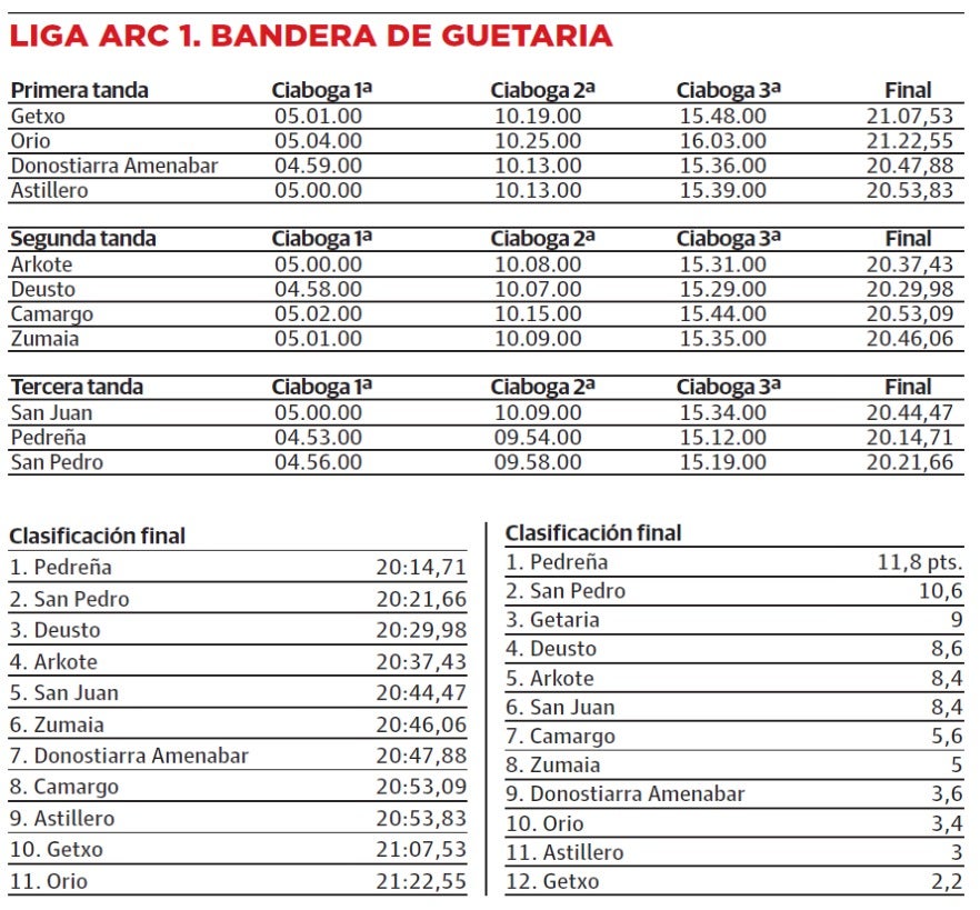 Pedreña ha ejercido este sábado de líder sólido en la ARC 1. 'La Pedreñera' sumó su cuarto triunfo consecutivo en esta temporada y ... se instala como un líder solvente de la categoría en la clasificación general. A partir de esta regata la puntuación, por el positivo de covid-19 de Getaria, se realizará por coeficientes sumando los puntos de todas las regatas y dividiendo el resultado por el numero de pruebas.