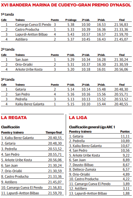 La 'Pedreñera' no pudo regalar una nueva victoria –hubiese sido la tercera de la temporada– a su afición. Los de Marina de Cudeyo regateaban ... en las aguas que mejor conocen, las suyas, pero eso no ayudó a un nuevo triunfo. edreña se quedó en la tercera plaza de la XVI Bandera Marina de Cudeyo-Gran Premio Dynasol, al ser superada por Kaiku y por el líder de la ARC 1, Getaria. El resto de botes cántabros de esta categoría transitó de nuevo por la zona baja de la tabla. Castro, Astillero y Camargo fueron octavo, noveno y décimo, respectivamente.