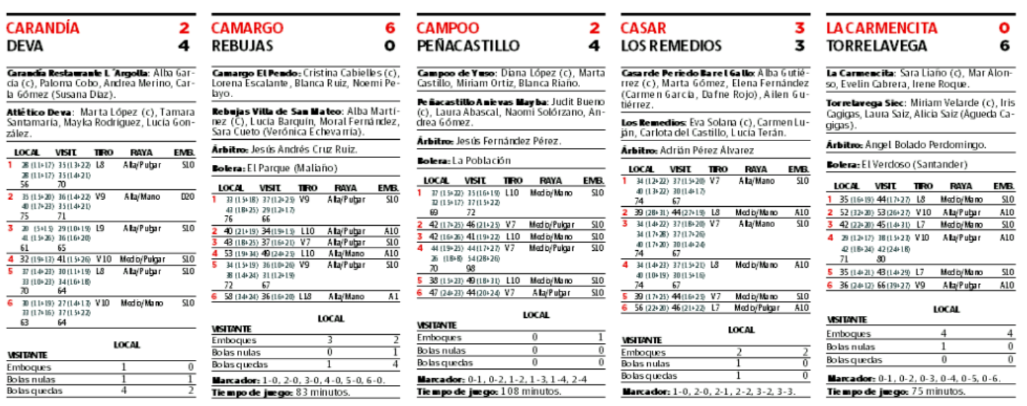 Campoo sí llegó al cierre en el tercero, lo que le permitió recortar distancias y llegar con opciones hasta un cuarto chico que fue clave. Las campurrianas aguantaron la embestida visitante e igualaron a 44 palos, pero un emboque de Laura Abascal en la segunda mano, con el cachi en la estaca, decantó el parcial y lanzó a un cuadro de Cañas que lo bordó en los dos siguientes, aunque en el cierre las locales respondieron para ajustar el marcador final A la estela del líder se sitúan Camargo y Deva. Las primeras no dieron opción a Rebujas, mientras que las de Unquera sufrieron para superar a Carandía. Menos problemas tuvo la Bolística para llevarse los puntos de El Verdoso en un buen partido.