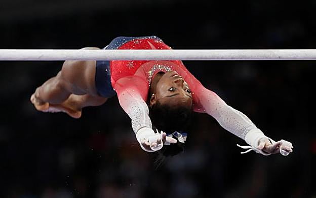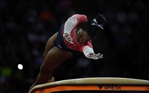 Afp Seis meses después de aquella desgarradora confesión, Simone Biles volvía a la competición por todo lo alto. Ni el descubrimiento de una piedra en el riñón que le obligó a pasar por el hospital dos días antes del inicio de los Mundiales de Doha fue capaz de apartarle de la gloria en aquella cita, en la que contribuyó al oro por equipos de la selección estadounidense y sumó su cuarto título en el concurso general con ejercicios de elevadísima dificultad, uno de sus sellos distintivos. Logró otras cuatro preseas en las finales por aparatos: oro en suelo y salto, plata en asimétricas y bronce en barra.