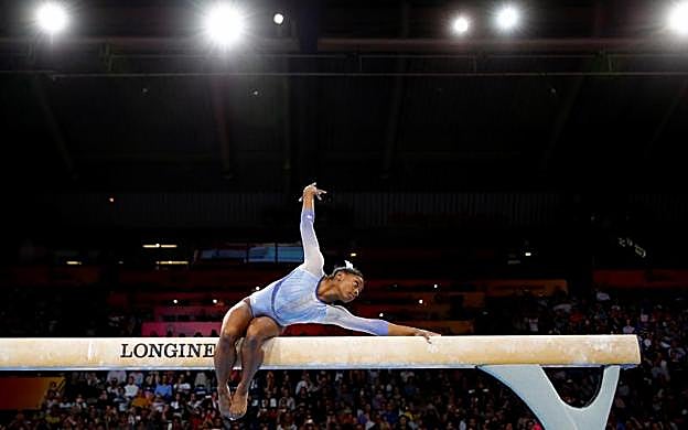 Wolfgang Rattay (Reuters) Las cinco preseas que abrochó en Glasgow 2015, sumadas a las que ya atesoraba, convirtieron a Simone Biles en la gimnasta más laureada en campeonatos del mundo. Conquistó el oro por equipos, suelo, barra y el concurso completo, además de colgarse el bronce en salto.