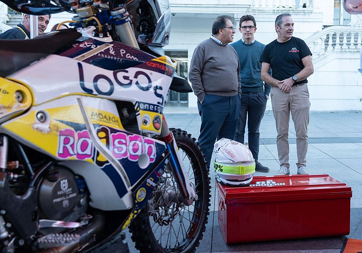 En un exclusivo acto en la Plaza de Italia, el piloto cántabro desveló la icónica montura con la que competirá en el rally más duro del mundo, arropado por leyendas como Chus Puras y Jose Luis Peña y con el respaldo de las instituciones locales