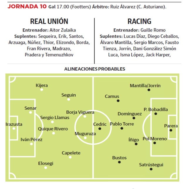 Pablo Torre regresa de estar concentrado con la selección española sub 19 y los técnicos le han protegido. Su fútbol enchufa al equipo, hace mejor a Bustos y le permite a Cedric ser lo que es. Para Marco Camus, el partido de hoy es vital. La ausencia de Soko para dos o tres semanas es un cursillo acelerado para el canterano. Y delante, el Real Unión de Irún, cuyo fútbol puede venirle bien al Racing. Los irundarras quieren la pelota y eso hace que la pizarra de Romo se ponga en verde.