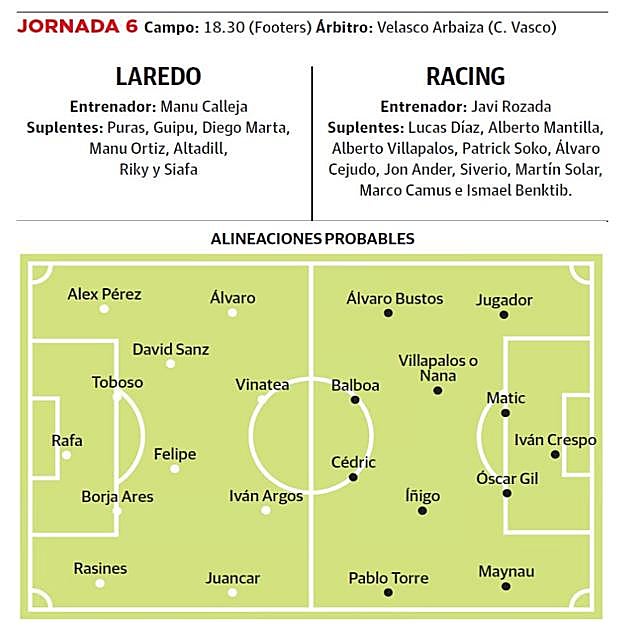 En cualquier caso, será el Racing el que proponga y el Laredo el que disponga –al menos ese es el guión esperado–. Chocarán con dos dibujos idénticos pero con dos intenciones diferentes. En los pejinos, Toboso sustituirá a Goñi en la zaga y Felipe a Faouzi en la medular y entre todos tratarán de neutralizar la iniciativa de un Racing decidido a tener la pelota y a ser protagonista. En parte porque son los 'mayores' del colegio y están obligados a ello. Sin embargo, el fútbol no entiende de favoritismos sin merecerles. El Laredo mando de vacío a casa al Barakaldo y al Real Unión cuando se acercaron a San Lorenzo. La vitola de recién ascendido se quita sin darse cuenta y los laredanos ya se han quitado parte. Su portero Rafa se está saliendo del mapa y su incombustible delantero, Vinatea, aporta las ganas de un debutante y la picardía de un repetidor.