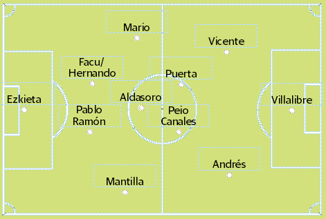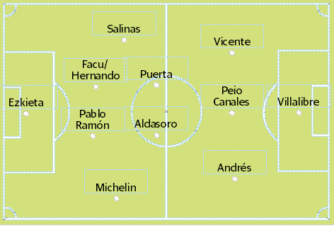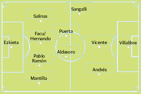La entrada de Sangalli como solución a los problemas de la banda izquierda en defensa sacrifica la presencia de Peio Canales en la mediapunta. Si la ocupa Íñigo Vicente no lo hace su joven paisano.Será decisión de José Alberto dejar a Salinas mucho más posicional y que sea el mediocentro quien ayude y así, podrían formar en ataque los dos jugones.